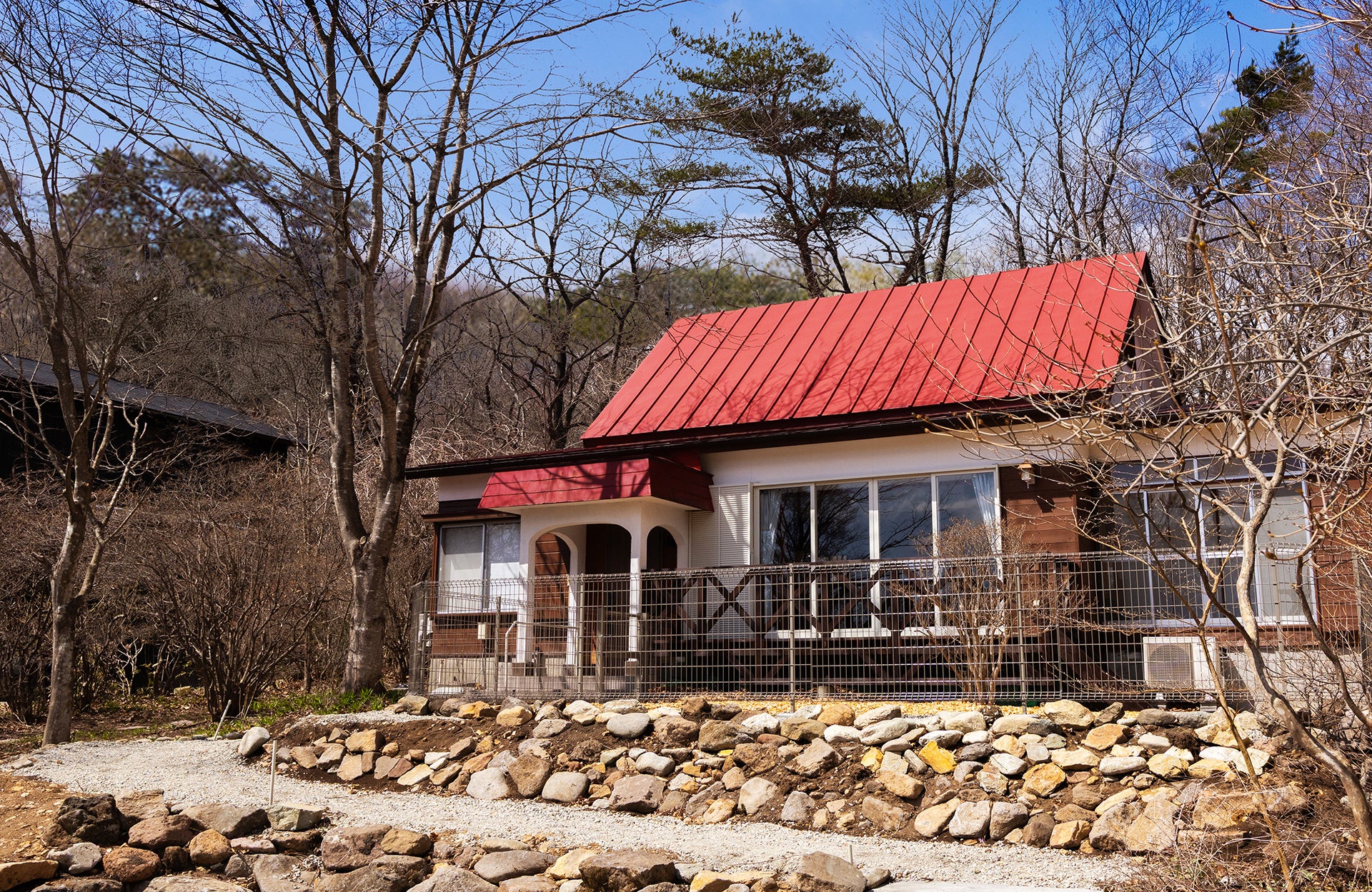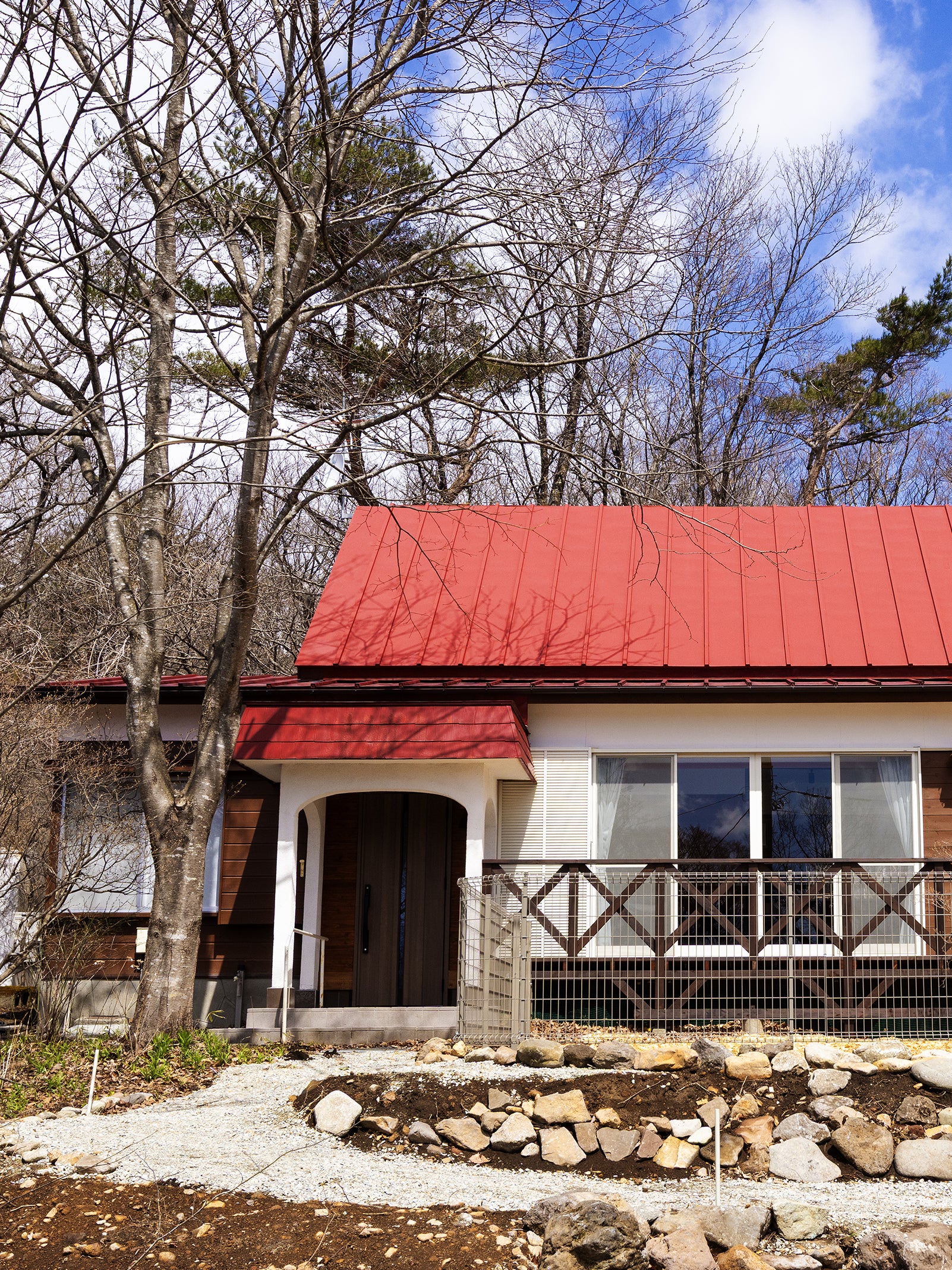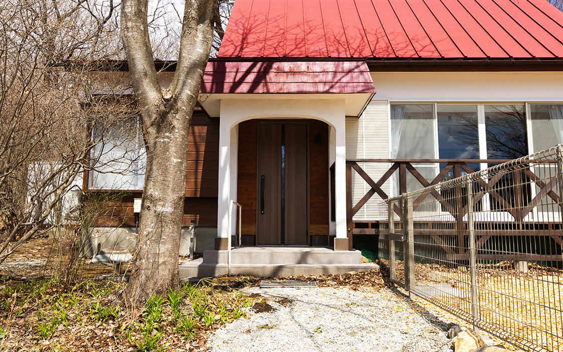 赤い屋根と白い壁のあたたかな外観、テラスやリビングでは四季折々の緑を眺めながら、愛犬や家族、友人とゆったり団らん。