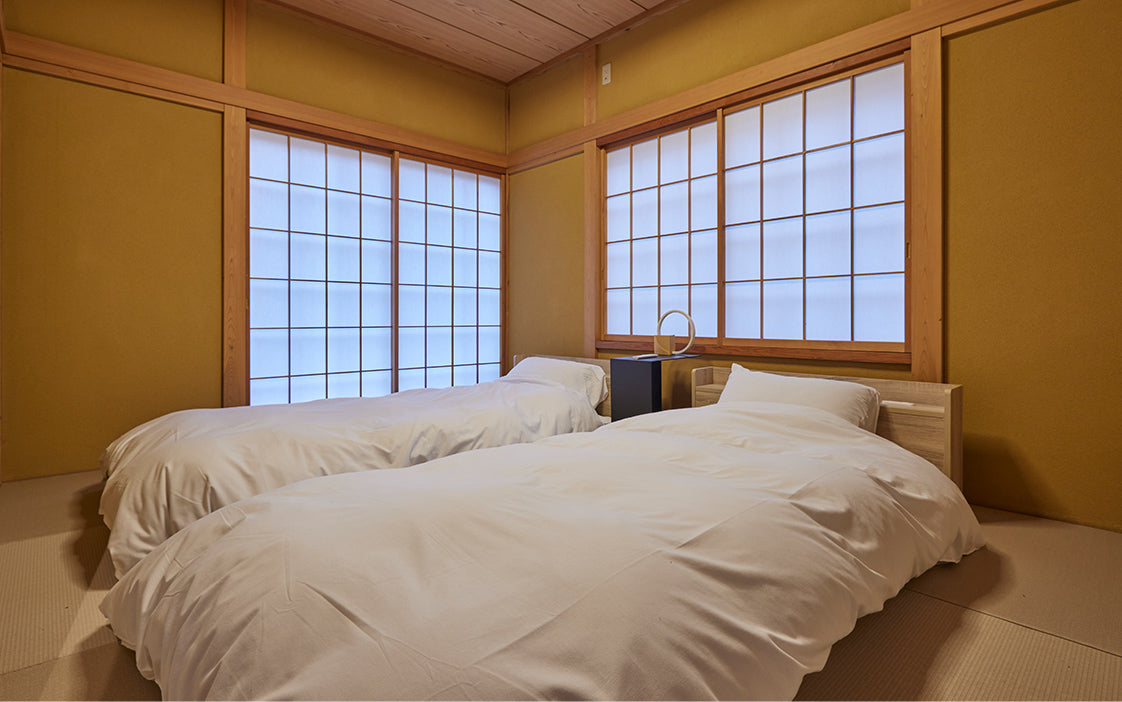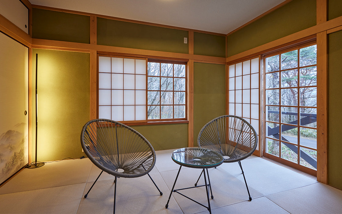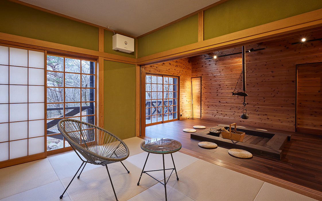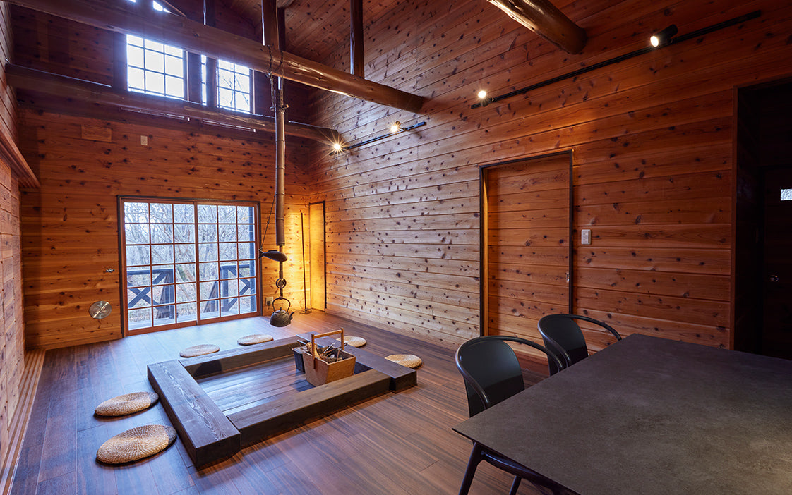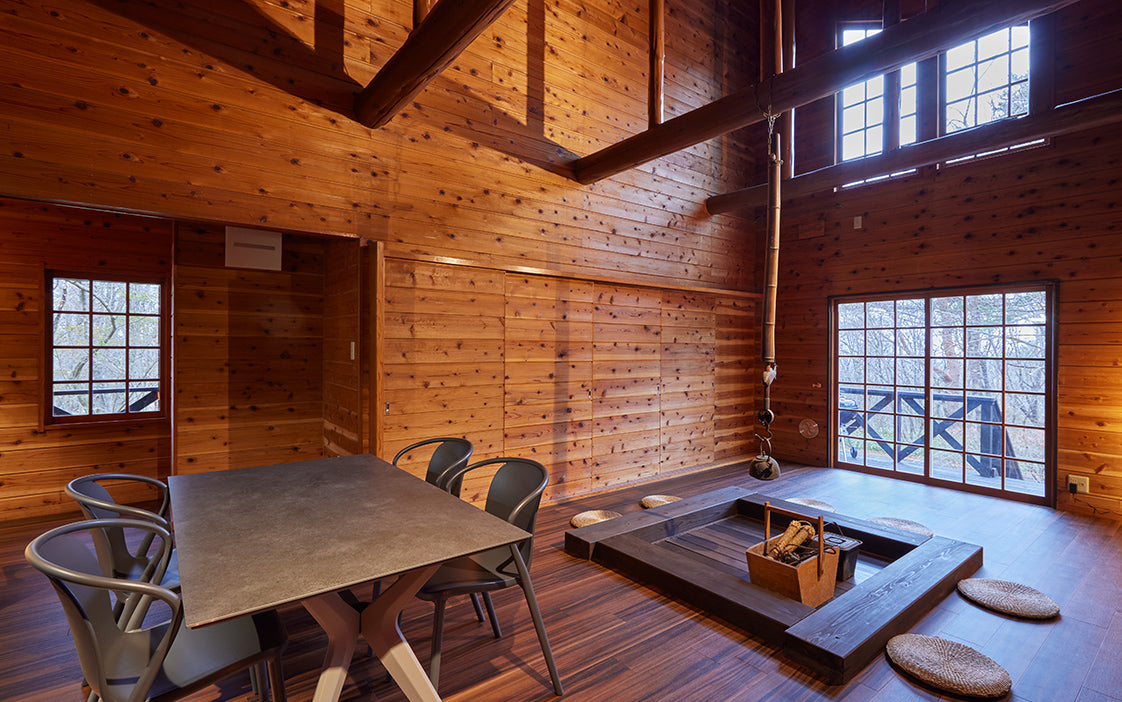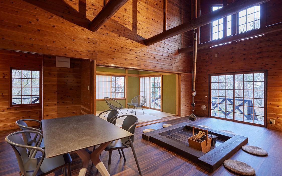 rinne 2nd living Nasu Garden Ⅱは、吹き抜けの囲炉裏リビングで和の趣を楽しむ贅沢な一棟貸しコテージです。