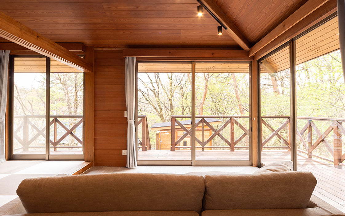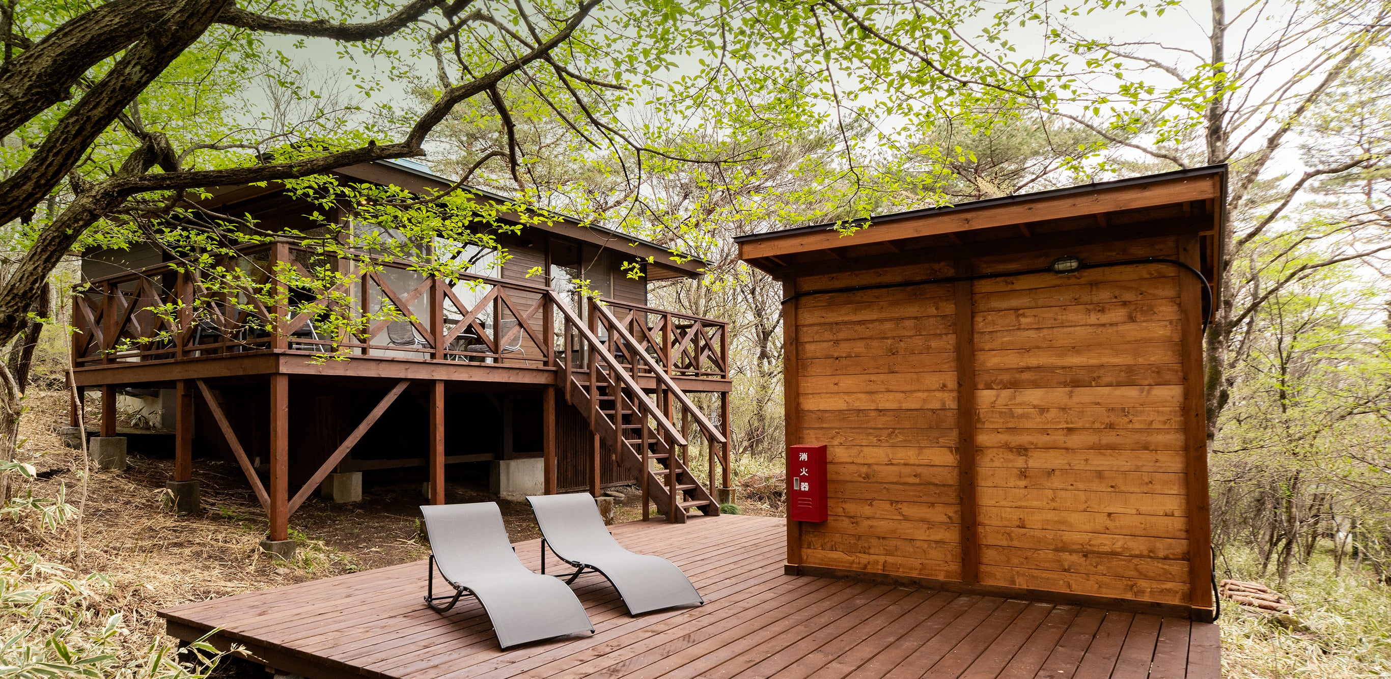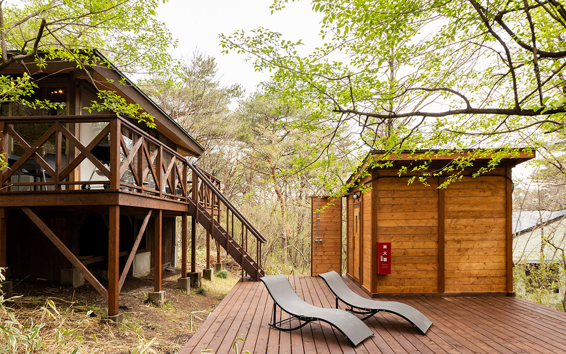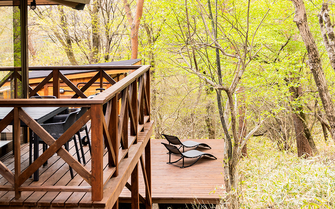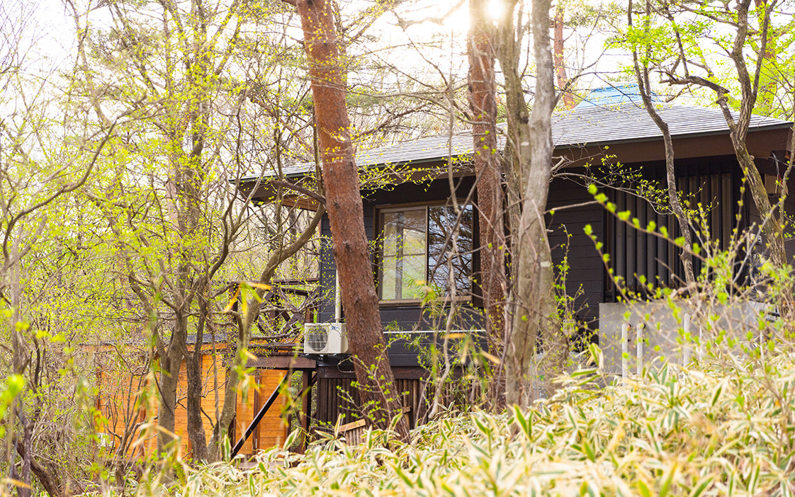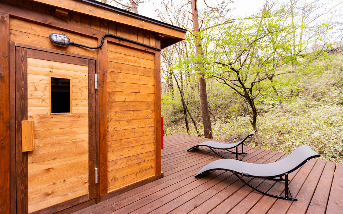 rinne 那須 Sauna Villa Ⅱは、森の奥にひっそりと佇み、まるで秘密基地のような一棟貸しの空間に、専用サウナと心地よいテラスが備わった、とっておきの隠れ家です。