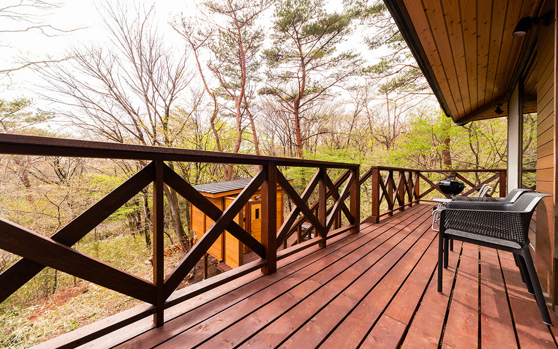 天候を気にせず過ごせる屋根付きデッキや、大きな窓から眺める緑が、日常の喧騒をそっと忘れさせてくれます。